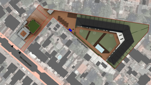 De begeleiderswoning en ontmoetingsruimte komen in het midden van het hofje. De fietsenstalling komt aan de kant van het voorplein.